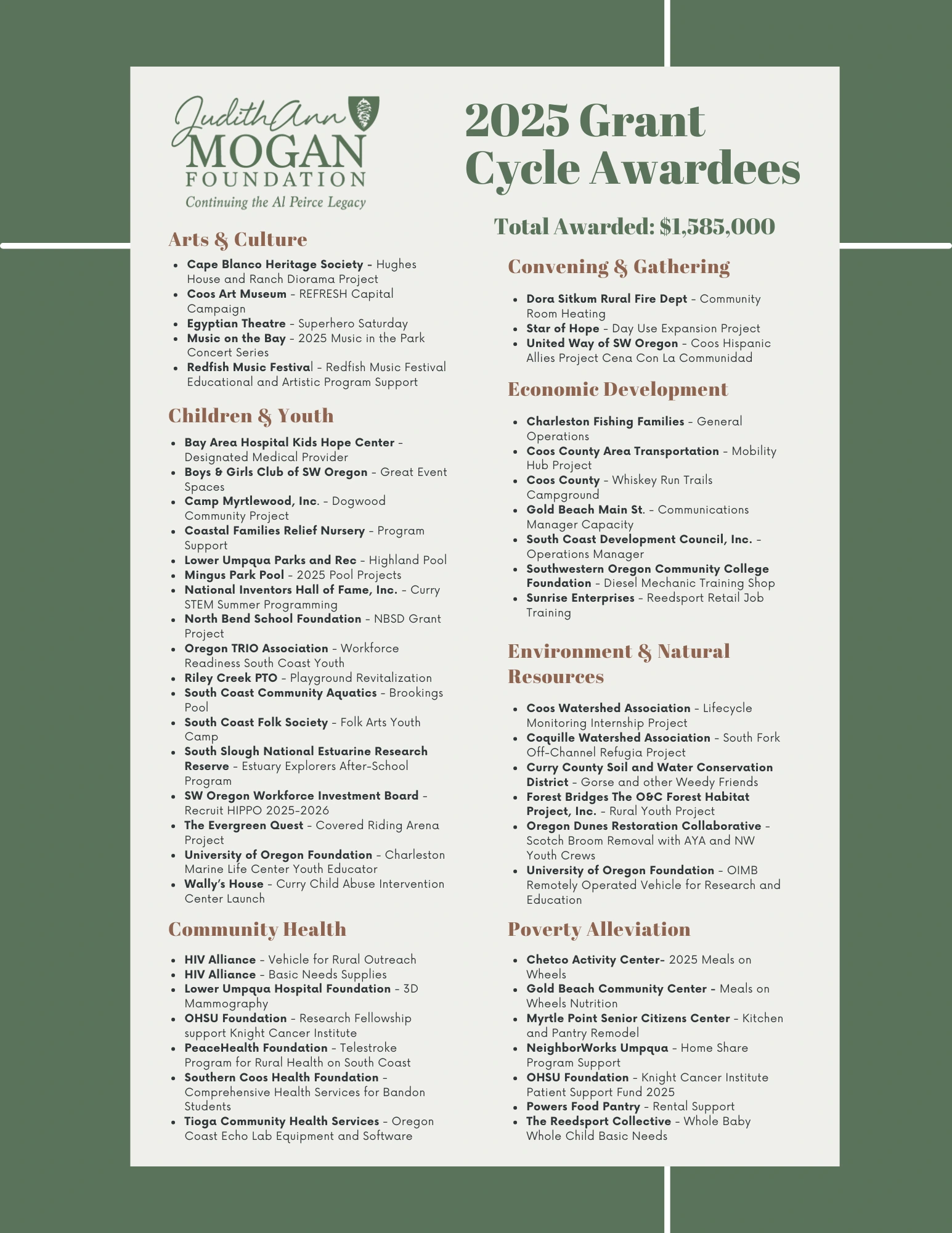 Coos Bay – March 1, 2025 — The Judith Ann Mogan Foundation (JAMF) opens its application portal for the 2025 Grant Cycle on April 4, 2025. Oregon nonprofits are invited to review JAMF’s updated funding guidelines and grant cycle timeline at www.jamoganfoundation.org before applying. Project beneficiaries must be in Coastal Douglas, Coos, or Curry Counties, and projects must fall under one or more of JAMF’s seven priority areas: Arts & Culture, Children & Youth, Community Health, Convening & Gathering Places, Economic Development, Environment & Natural Resources, and Poverty Alleviation. To apply for a grant, please submit requests via the online application portal found on the JAMF website. For the 2025 Grant Cycle, JAMF is offering two (2) grant programs: a Small Grant program (request of $25,000 or less) and a Large Grant program (request of more than $25,000). The Large Grant program has a Letter of Inquiry (LOI) stage after which qualified applicants will be invited to fill out the Grant Application form. The Small Grant program omits the LOI stage