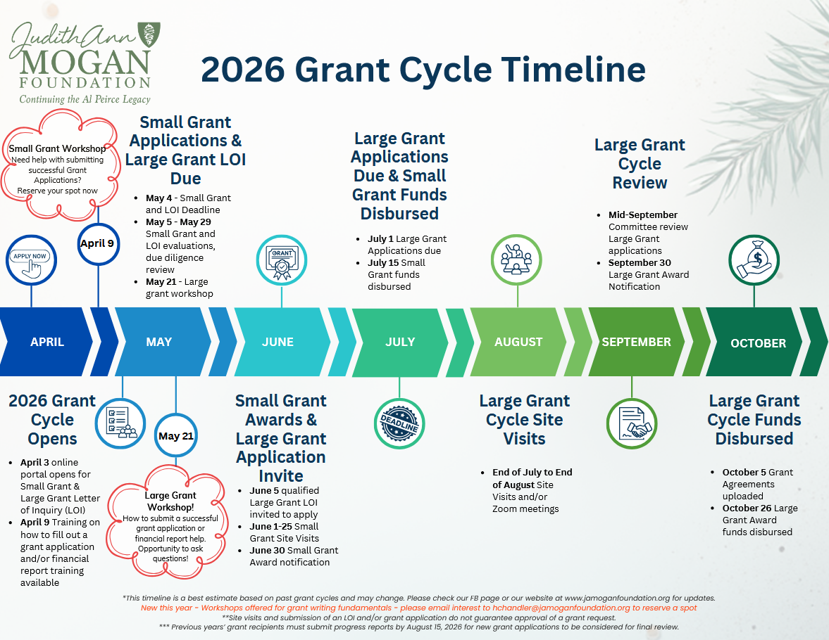 * All grantees are required to provide updates, a final report, and share project impact and/or challenges and learnings. We encourage all interested parties to download, print, and add the 2026 Grant Cycle timeline (found HERE) to your calendar. Missed deadlines will disqualify an application.